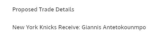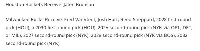纽约尼克斯:送出杰伦・布伦森、乔什・哈特、里德,以及2026年次轮选秀权(通过魔术/活塞/雄鹿)、2027年次轮选秀权、2028年次轮选秀权(通过凯尔特人)、2032年次轮选秀权,最终得到扬尼斯・阿德托昆博;