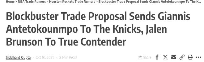 美媒提史诗级3方交易方案:字母哥去尼克斯,布伦森去火箭?